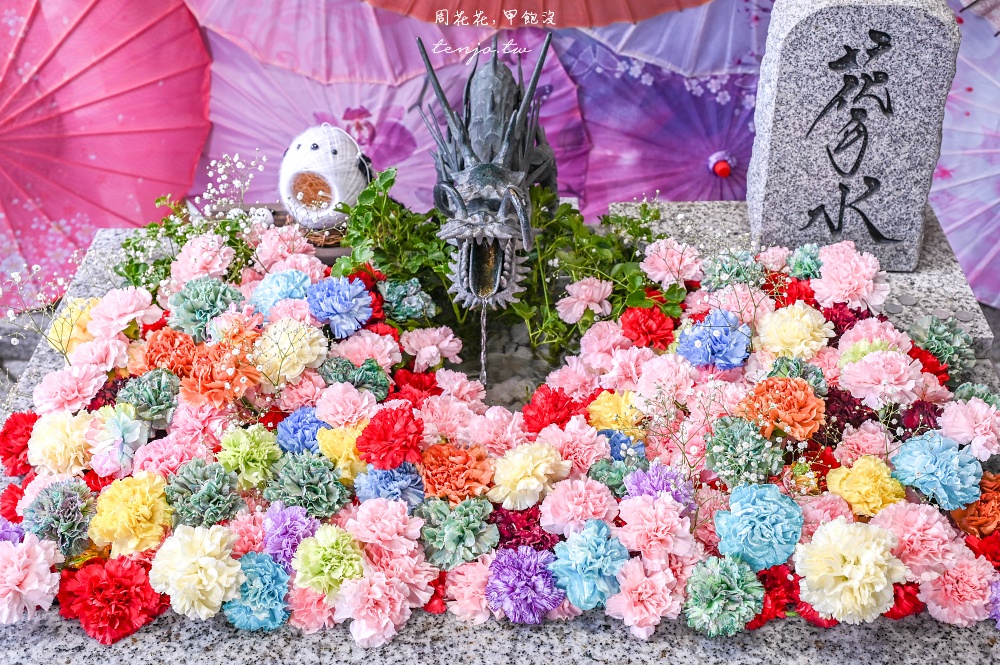 《札幌諏訪神社》後來會在社群上爆紅,是因為有超美鮮花花手水,周圍還用和傘做佈置