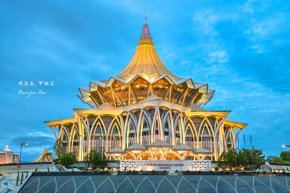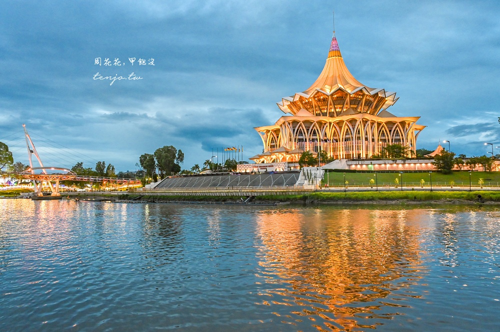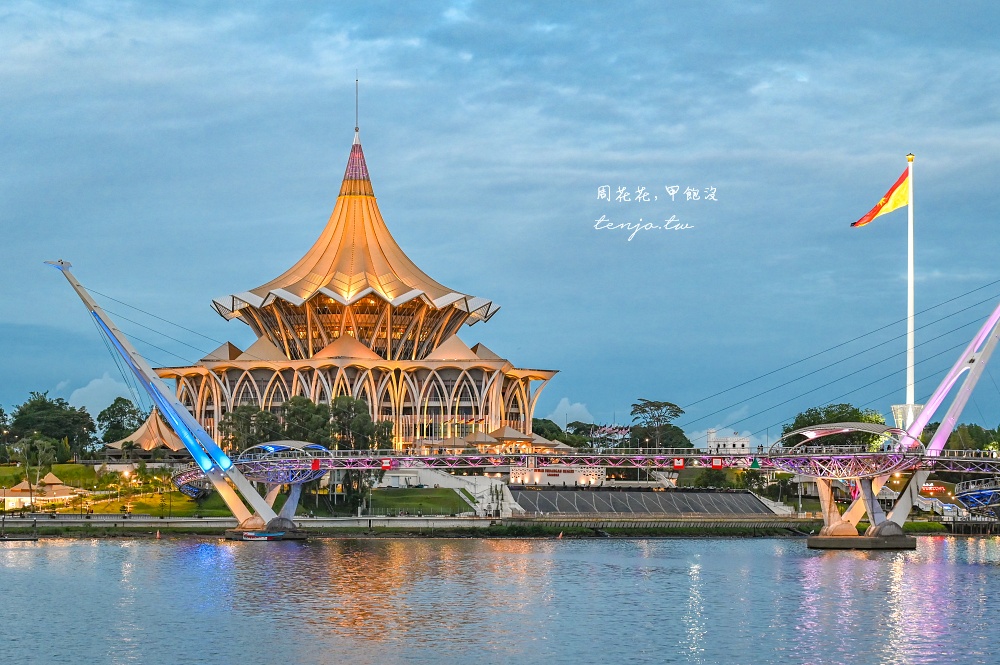 「砂拉越新州立法議會大廈」是最具代表性的古晉地標,與「黃金橋(達魯哈納黃金吊橋)」的構圖相當漂亮