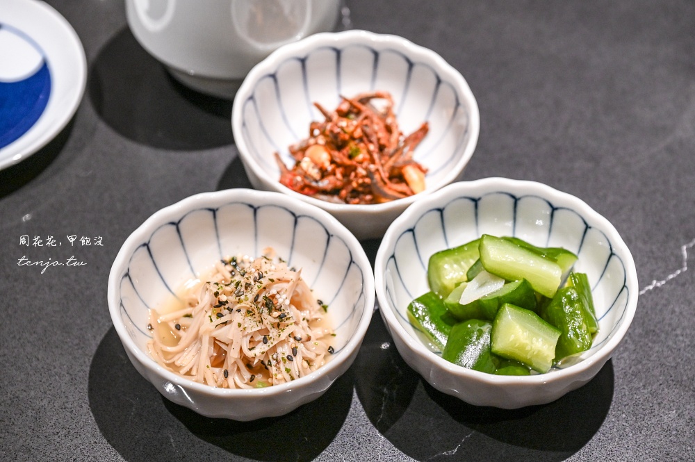 開胃前菜:花生小魚乾、杏鮑菇蕎麥麵、醃漬黃瓜