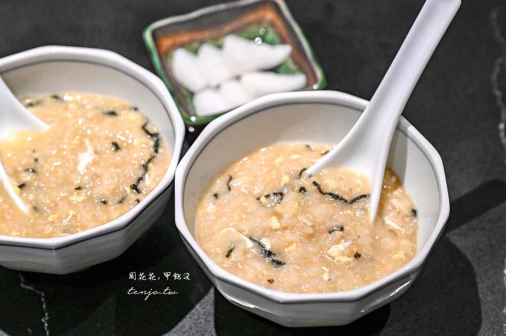 煮好後會先讓客人確認口味鹹淡、粥品軟硬度是否都合口味,最後再倒入雞蛋、撒上海苔絲,並附上醃漬白蘿蔔讓你一起享用