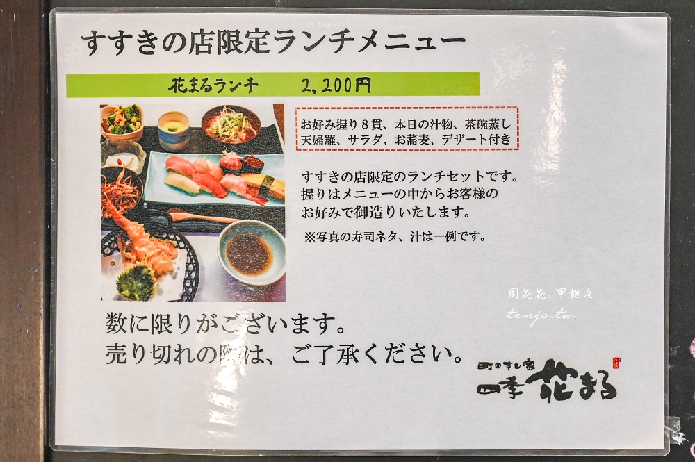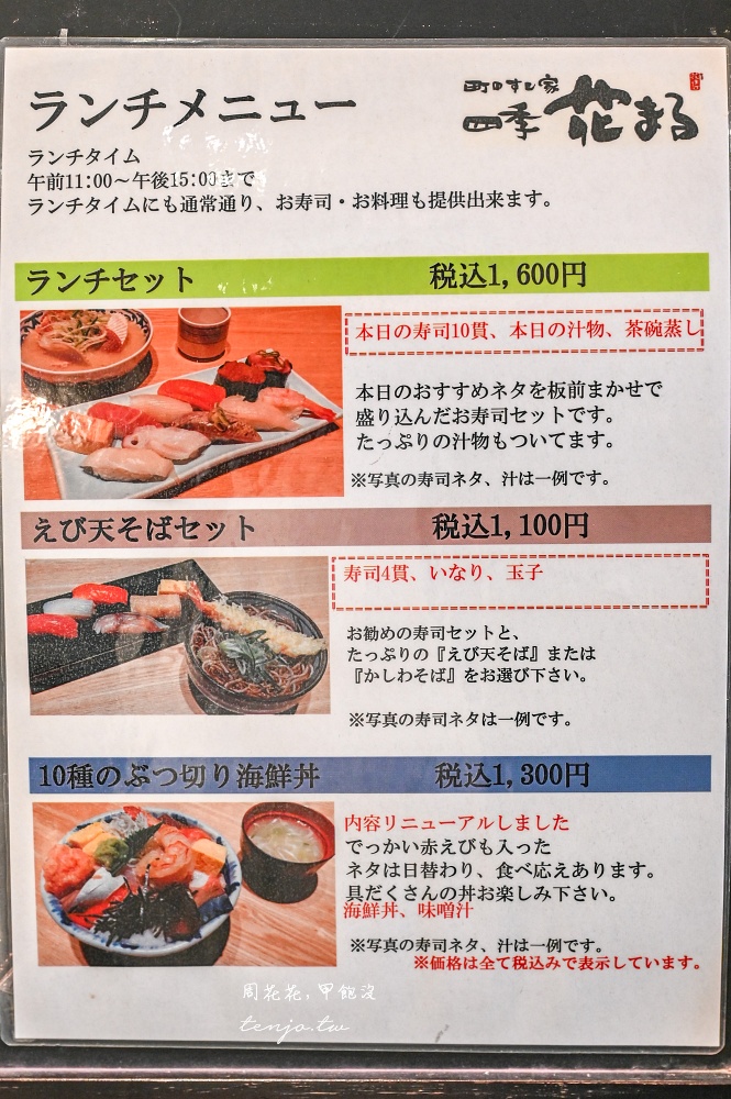 目前午餐共有四種版本,最便宜的四貫握壽司+天婦羅蕎麥麵只要1,100円,海鮮丼飯+味噌湯1,300円