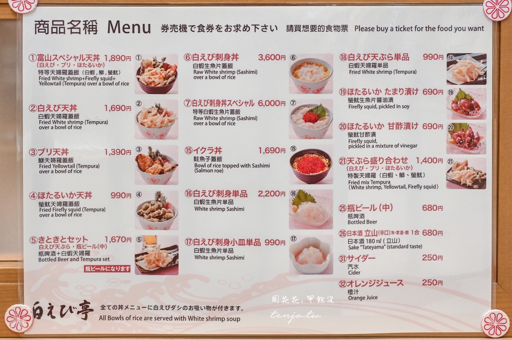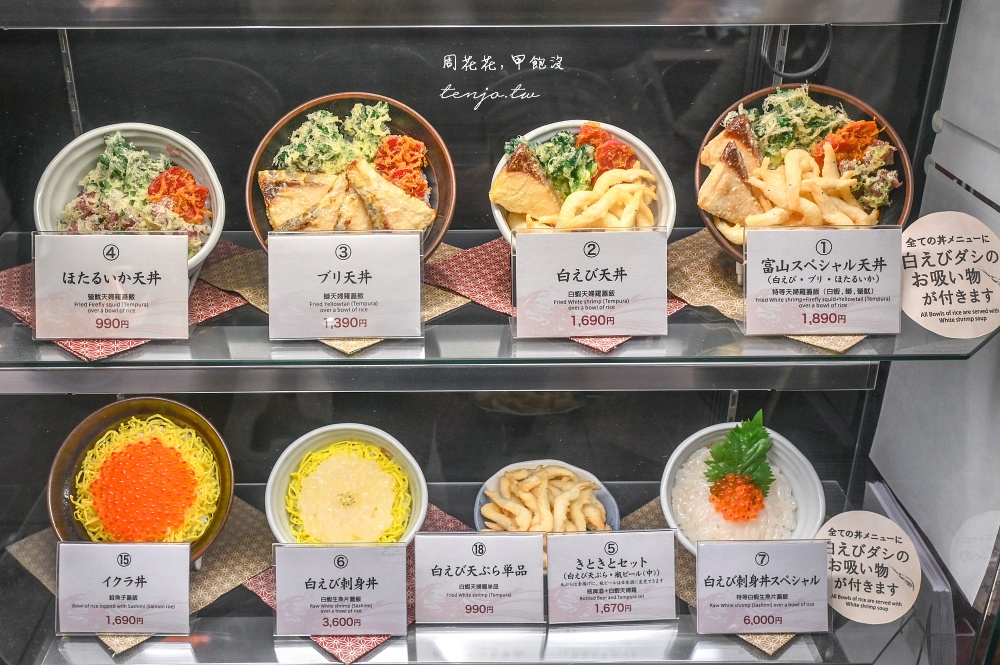 《富山白蝦亭 (白えび亭)》菜單主打富山白蝦所製作的料理,天婦羅、白蝦刺身、白蝦丼飯都很厲害