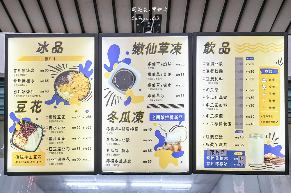 分成冰品、豆花、嫩仙草凍、冬瓜凍、飲品幾大類,其中賣最好的就屬雪片黑糖冰