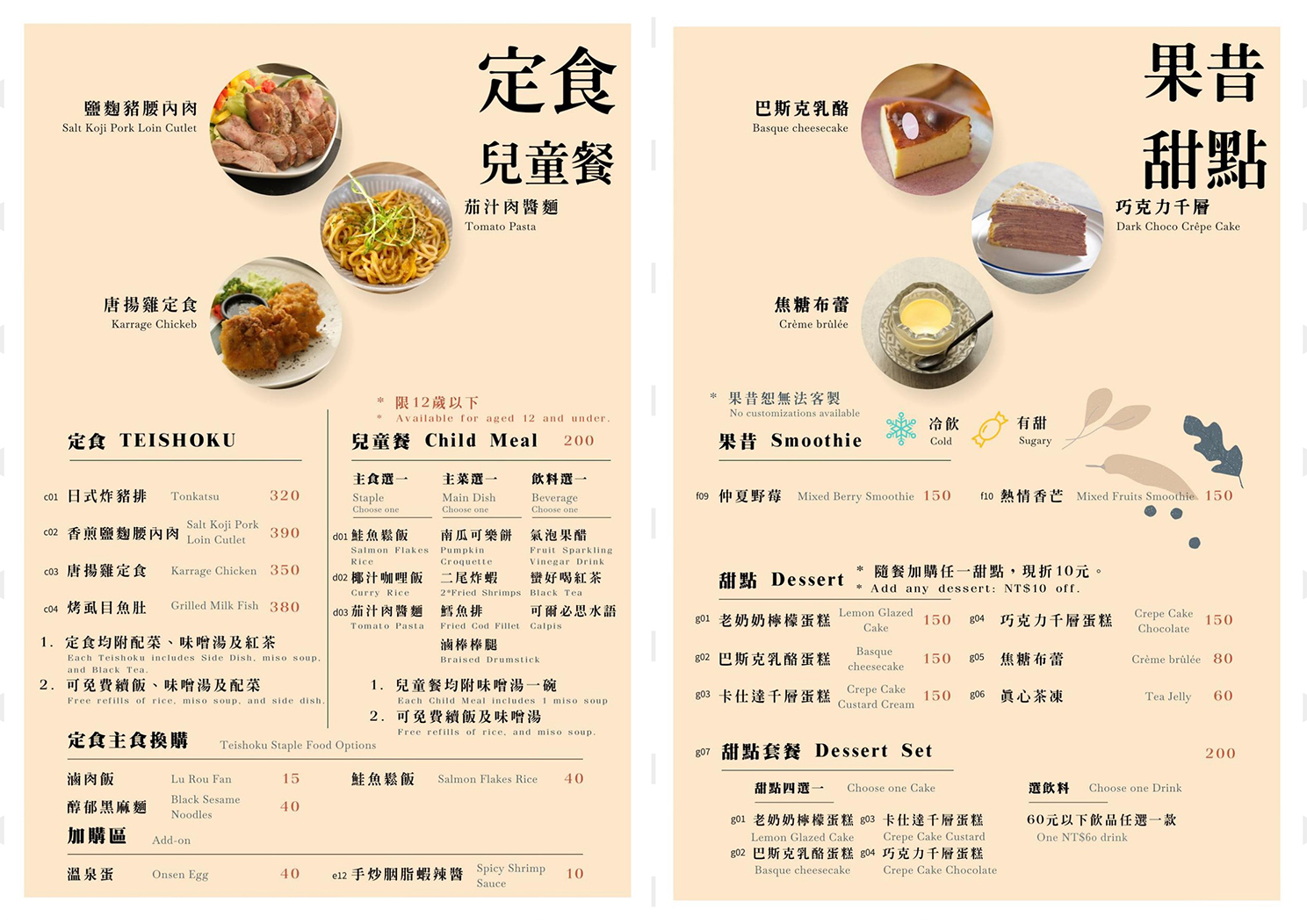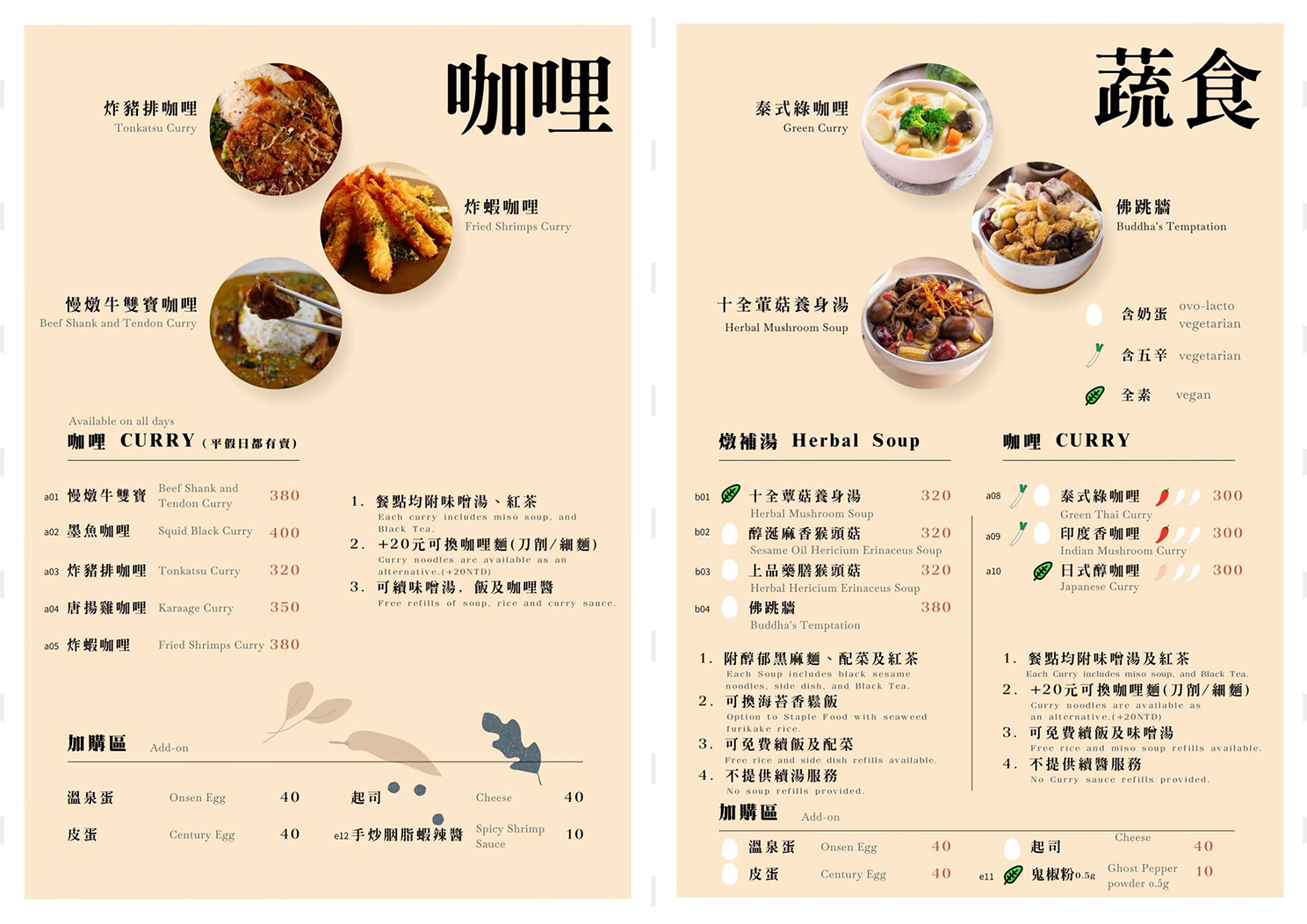菜色有咖哩、蔬食、定食、兒童餐、果昔甜點,餐點皆附味噌湯、紅茶