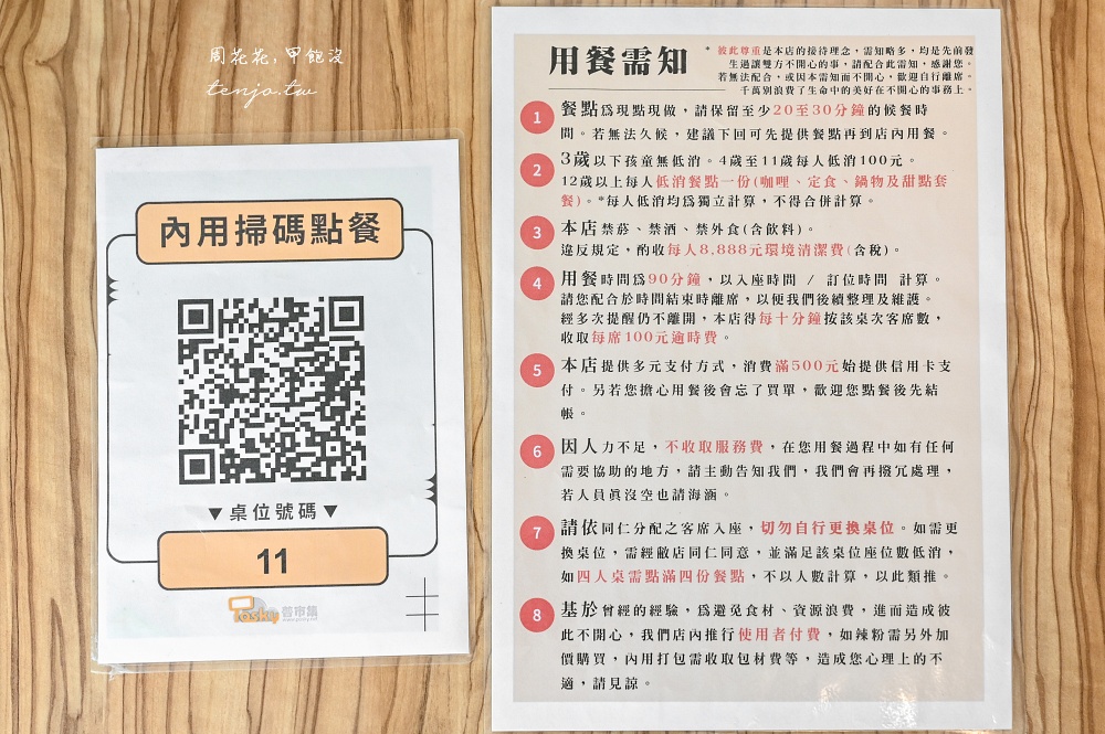 低消每人一份餐點,用餐時間限時90分鐘等,其實都是一些很基本的規定,直接寫出來讓大家可以先參考