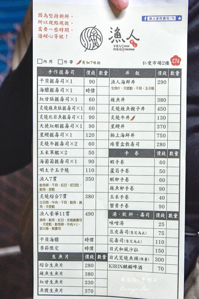 《漁人手作壽司》菜單如下,現在的價格品項已有調整,最新版菜單建議看google map