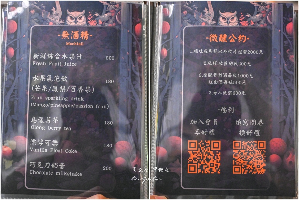 《微醺花園小酒館》菜單如下,每人低消600元,付款方式現金/信用卡/行動支付皆可