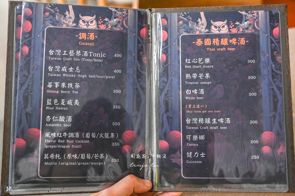 必點的飲料則為招牌茶酒,均為《微醺花園小酒館》自家製造,其他酒館可喝不到;如果想喝調酒、泰國精釀啤酒,或是無酒精飲料的人,也都能有不少選擇