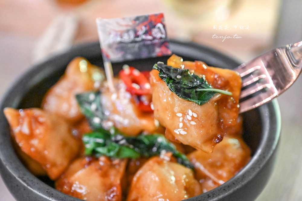 《微醺花園小酒館》菜單必點菜色就是這份招牌炒水餃,有著極佳的視覺色澤