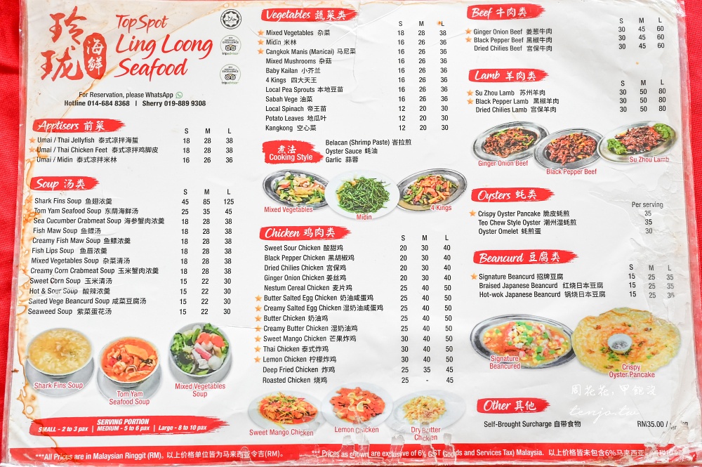 「玲瓏海鮮餐廳」菜單如下,品項和價格都標示的很清楚