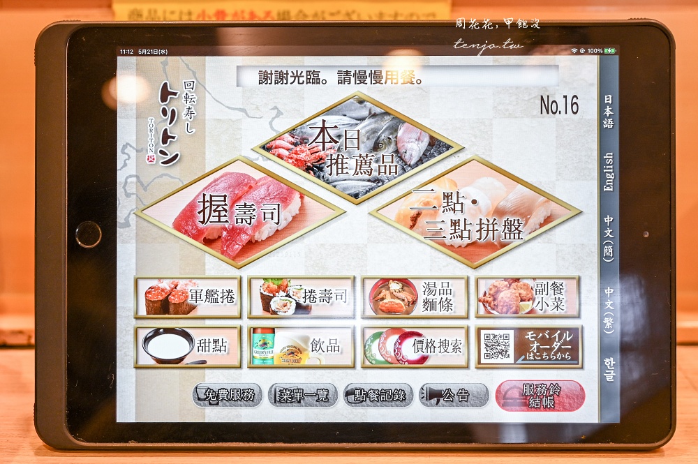 《迴轉壽司Toriton》菜單全以平板顯示為主,可以選擇繁體中文非常貼心