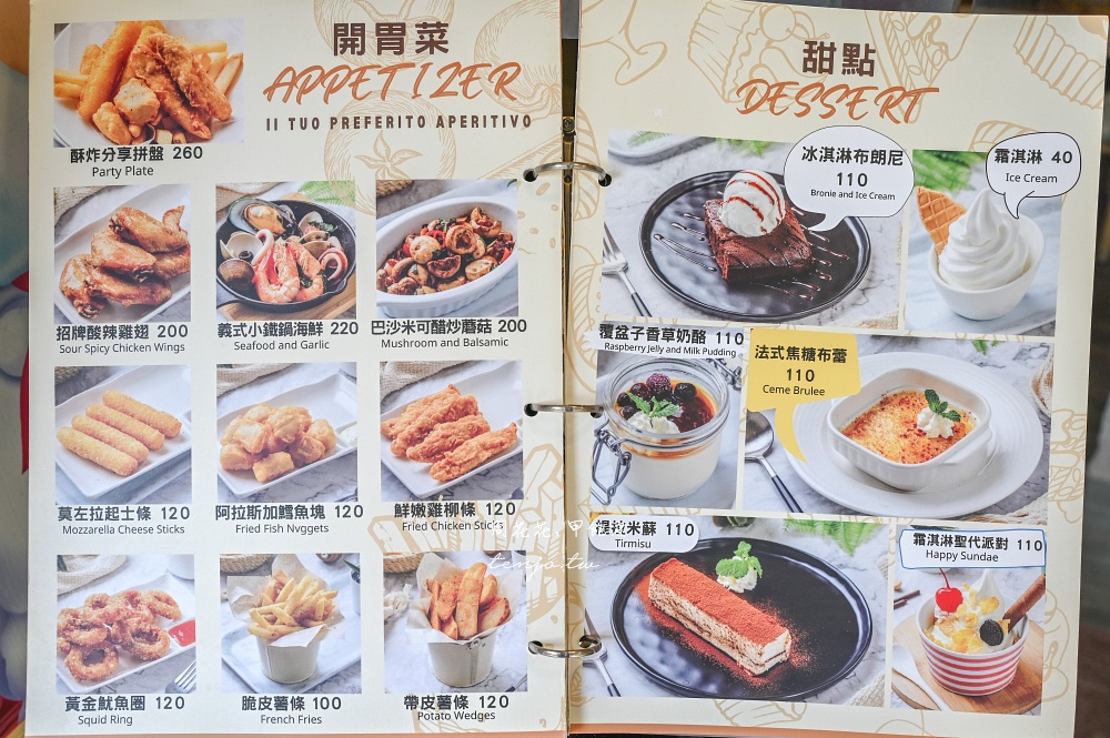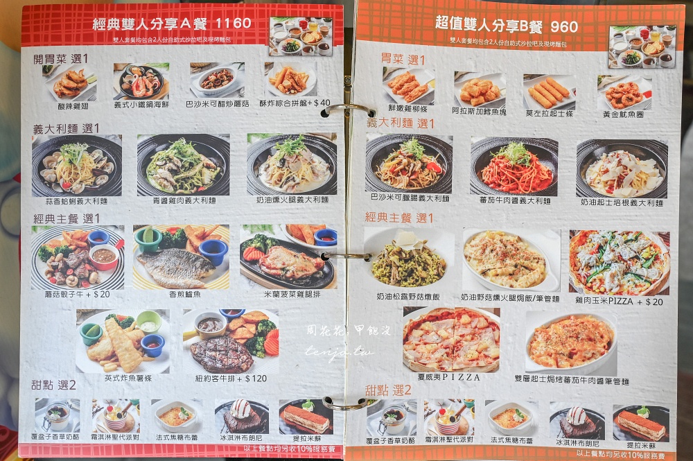 不少網友推薦點雙人分享餐,份量十足光看就覺得吃完會很飽,其他餐點還有威尼斯薄皮披薩、焗烤、燉飯、義大利麵、兒童餐、開胃菜、甜點