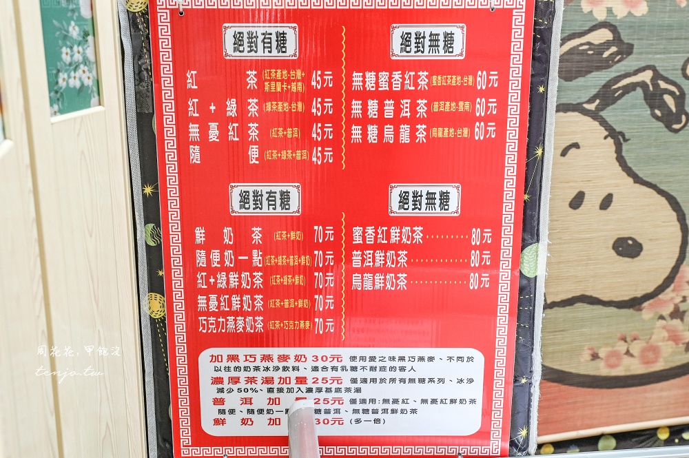 紅茶、綠茶、普洱茶、鮮乳坊牛奶幾種可以做排列組合,跟我一樣習慣喝無糖飲料的人,也有蜜香紅茶、普洱茶、烏龍茶三種選擇