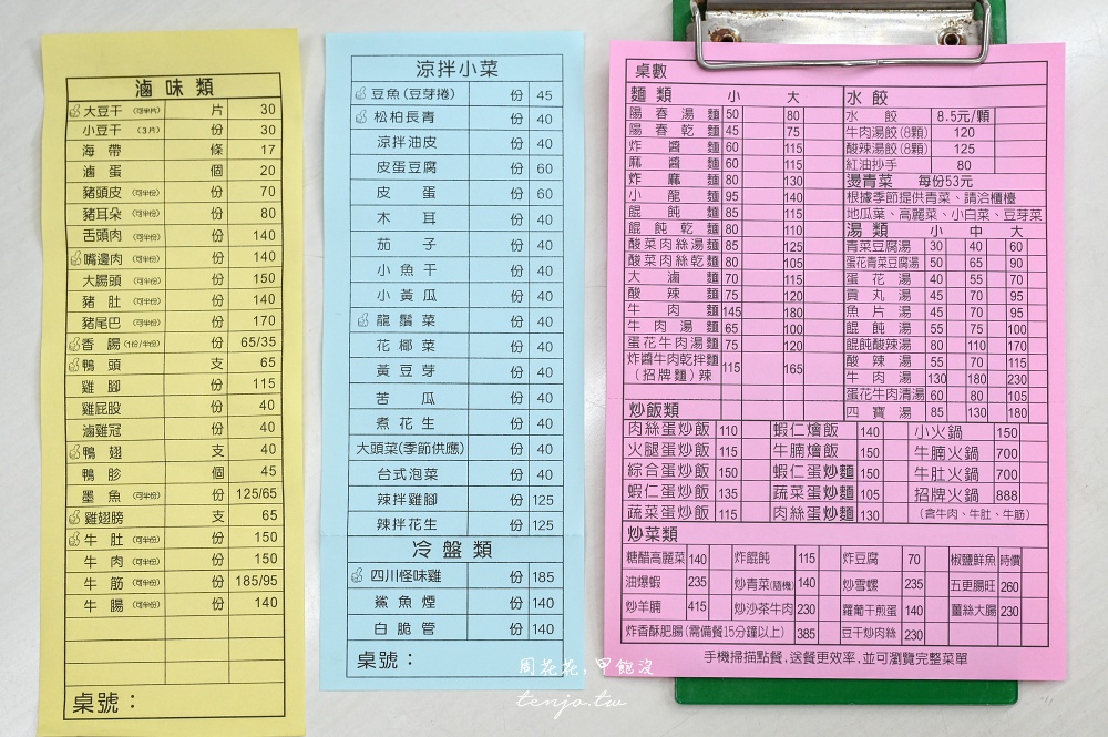 分成滷味類、涼拌小菜、冷盤類、麵類、炒飯類、水餃、燙青菜、湯類、炒菜類幾種品項