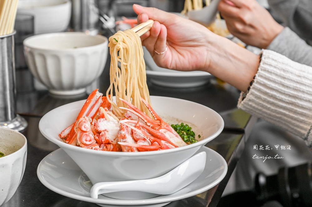 三倍紅楚蟹拉麵份量真的有夠浮誇!螃蟹量多到讓人一時不知從何吃起,只能先拿起來放在盤子上