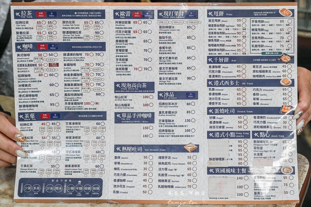 飲料有拉茶、咖啡、茶飲、歐蕾、果汁、冰沙、現泡高山茶,搭配手作甩餅、千層餅、港式西多士、蛋燒吐司、港式小點、點心、異國風味主餐,菜色選擇非常多元