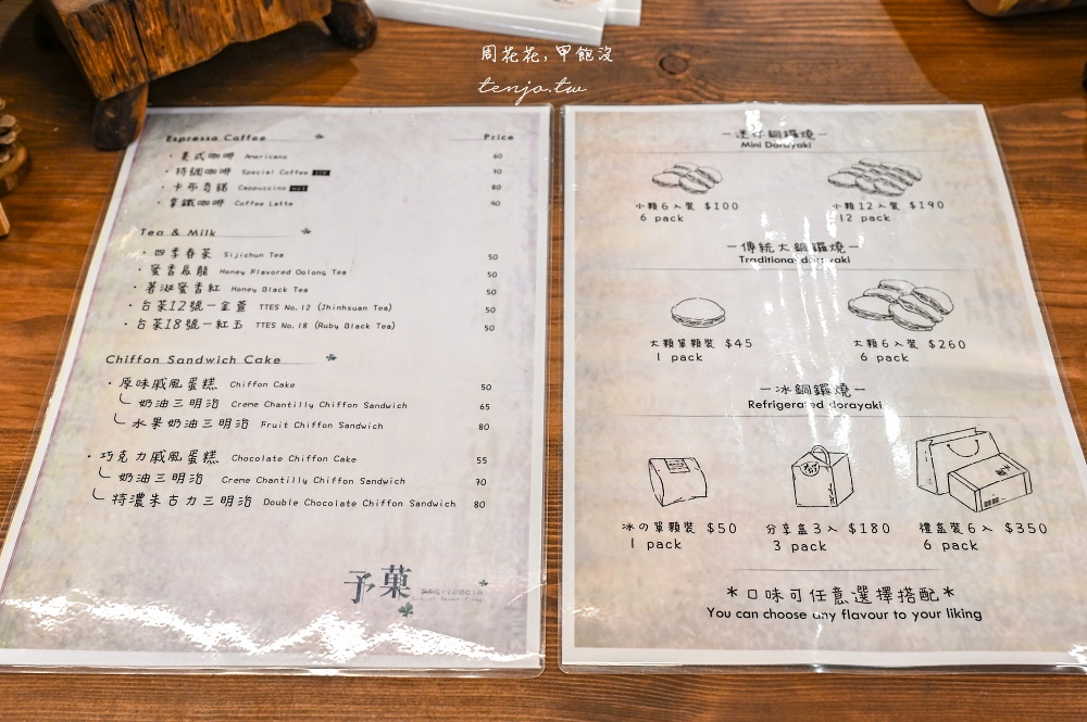《予菓銅鑼燒&手作烘焙工坊》菜單如下,內用外帶都未強制規定每人低消