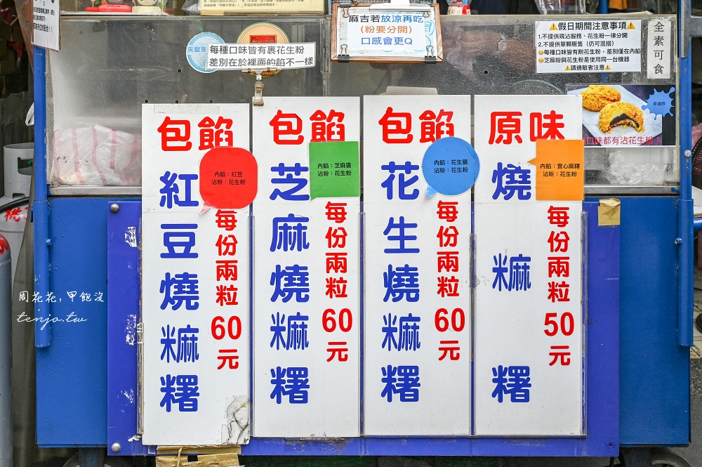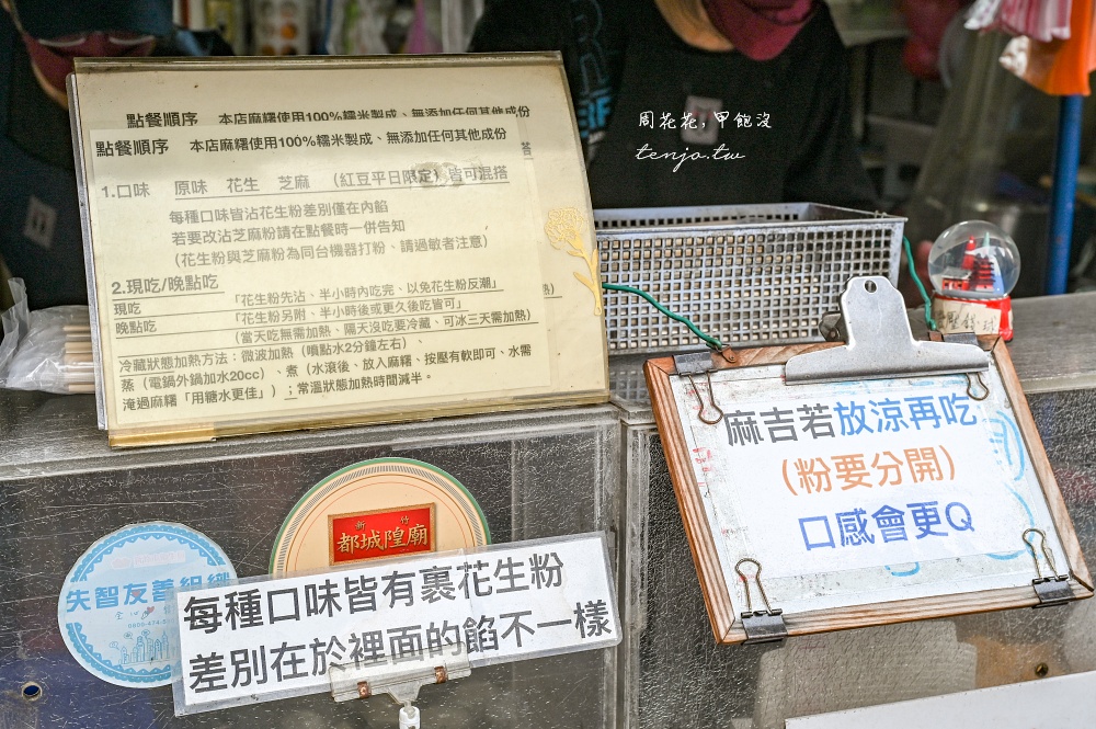 《周家燒麻糬》攤位前寫有貼心提醒,現吃、晚點吃該怎麼吃,買回家冷藏後如何加熱,都寫得相當清楚